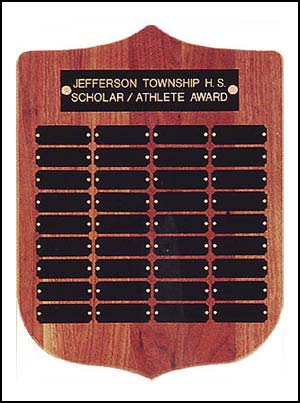 12” x 16” walnut perpetual shield plaque with 36 plates Engraving is an additional $6 cost for each plate, excluding the header.