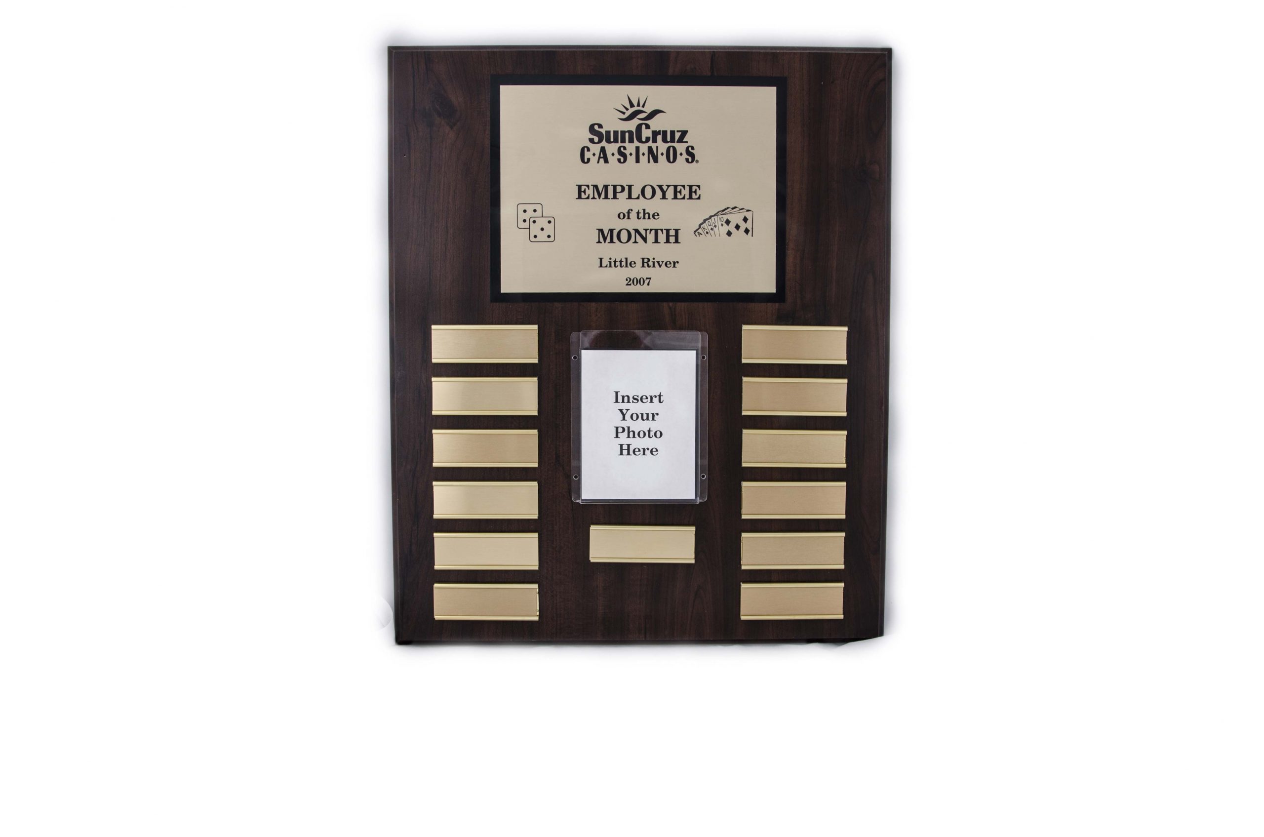 15” x 18” oak wood finished plaque with 13 gold plates and photo insert – SOM1518 Engraving is an additional $6 cost for each plate, excluding the header.