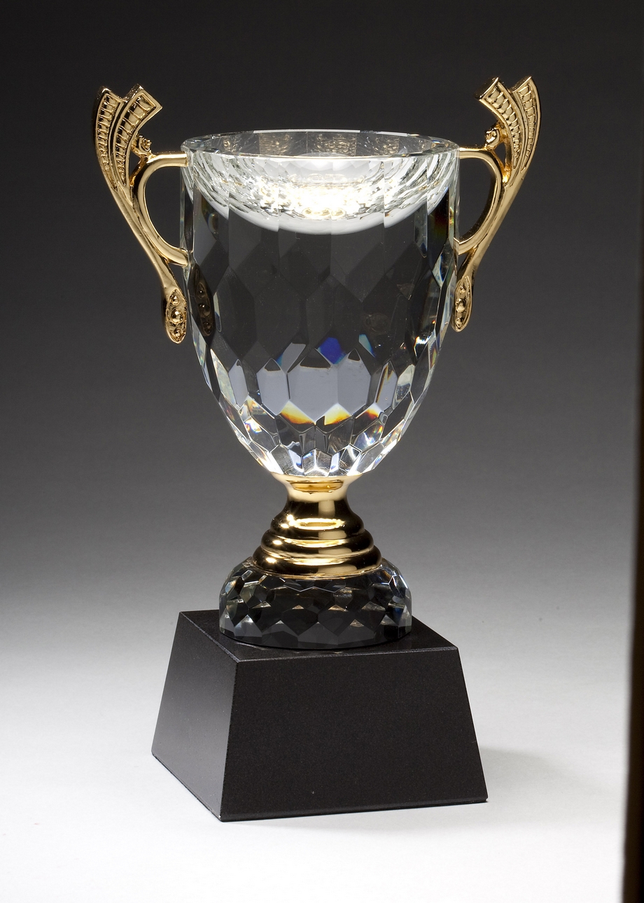 7.5 inch crystal cup with gold handles and stem on black base quantity