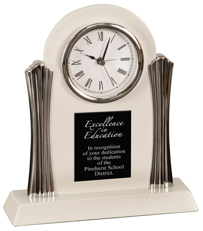 8.25” x 7.5” white piano finished desk clock with silver metal columns – T207