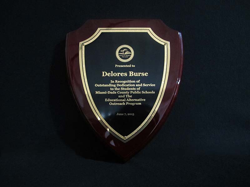9.5 inch crest shaped rosewood piano finish plaque with gold trim quantity