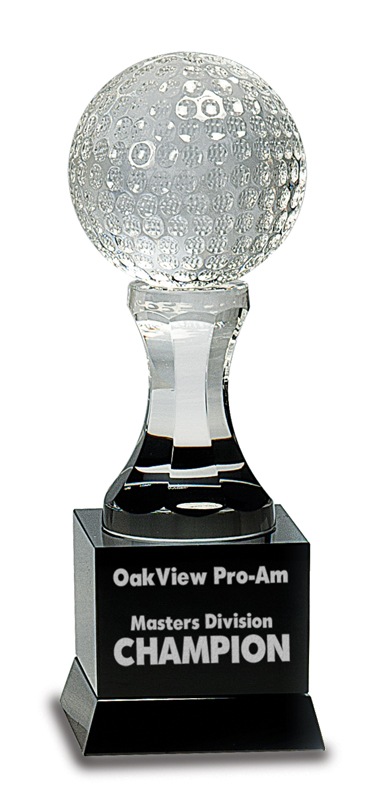 9 inch crystal golf ball and tee award on black base – CRY008G