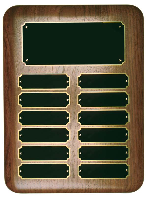 9” x 12” walnut perpetual plaque with 12 plates – EPP12 Engraving is an additional $6 cost for each plate, excluding the header.