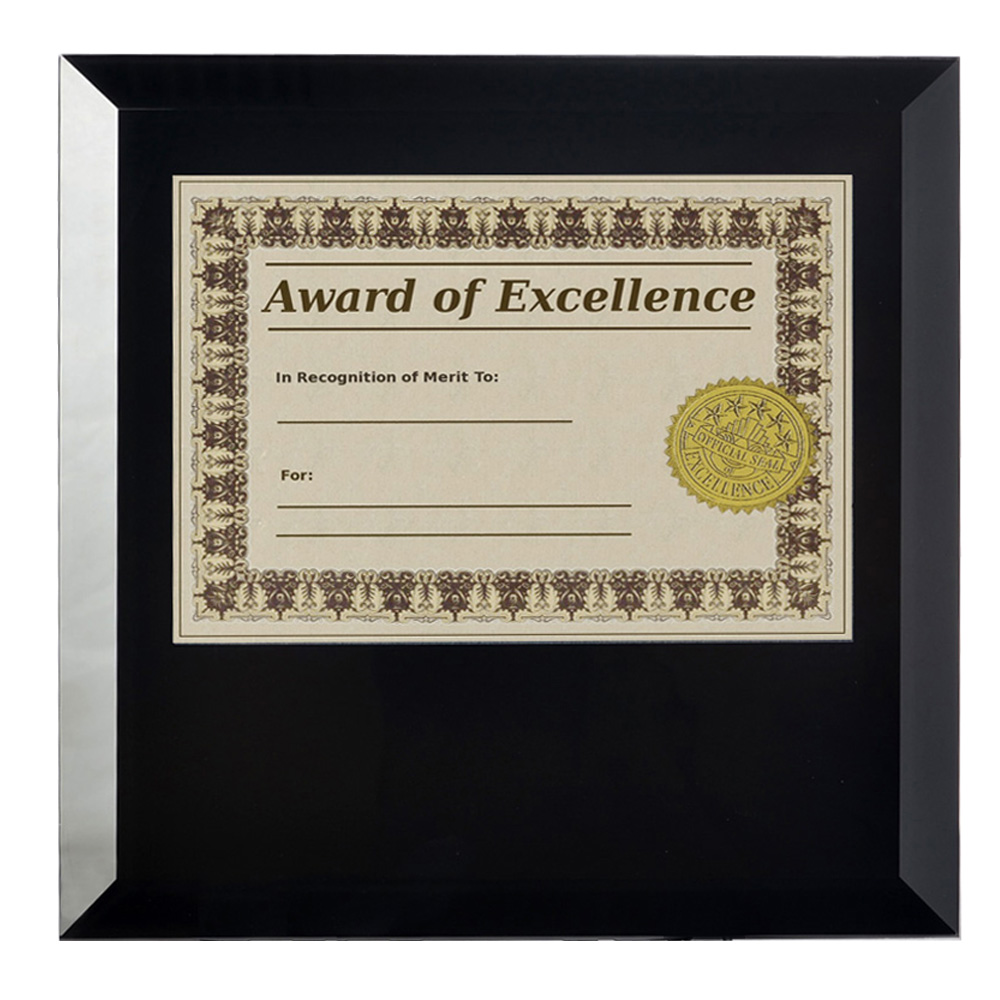 9'' x 9'' black glass certificate and document holder, with 5'' x 7'' window quantity