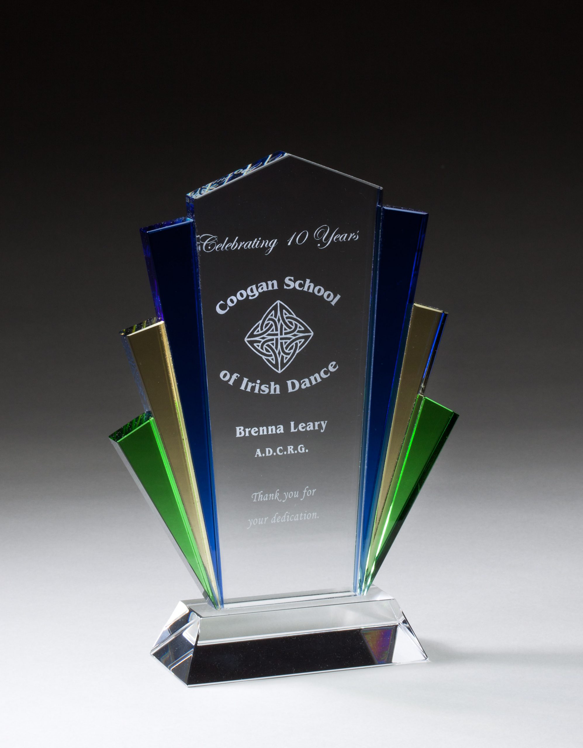 Glass award with blue, green, and gold sides – GL69 GL69, GL70, GL71