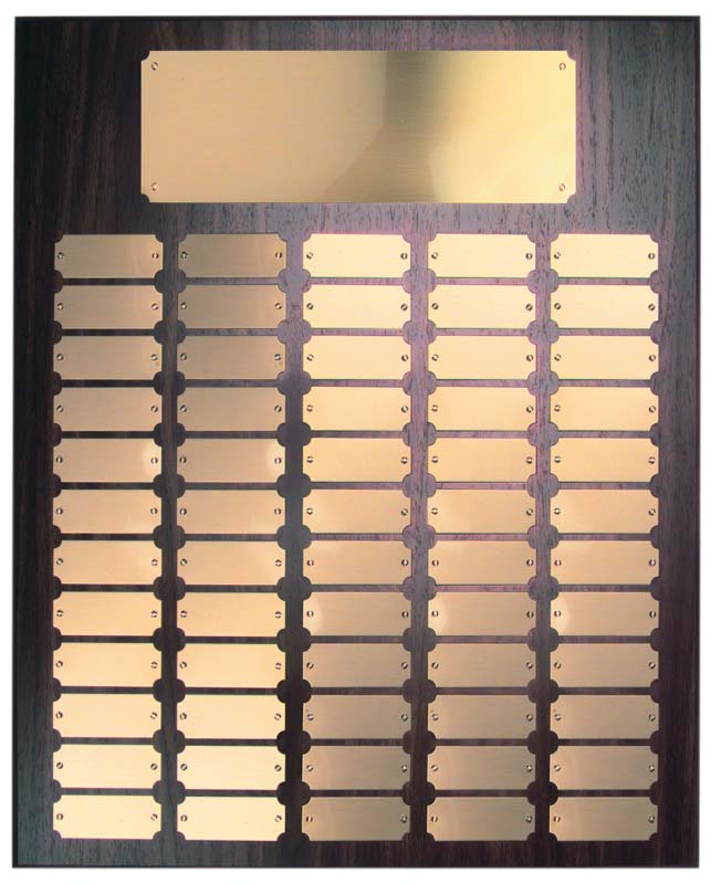 Walnut finished perpetual plaque with brass plates – WFP60G Engraving is an additional $6 cost for each plate, excluding the header.